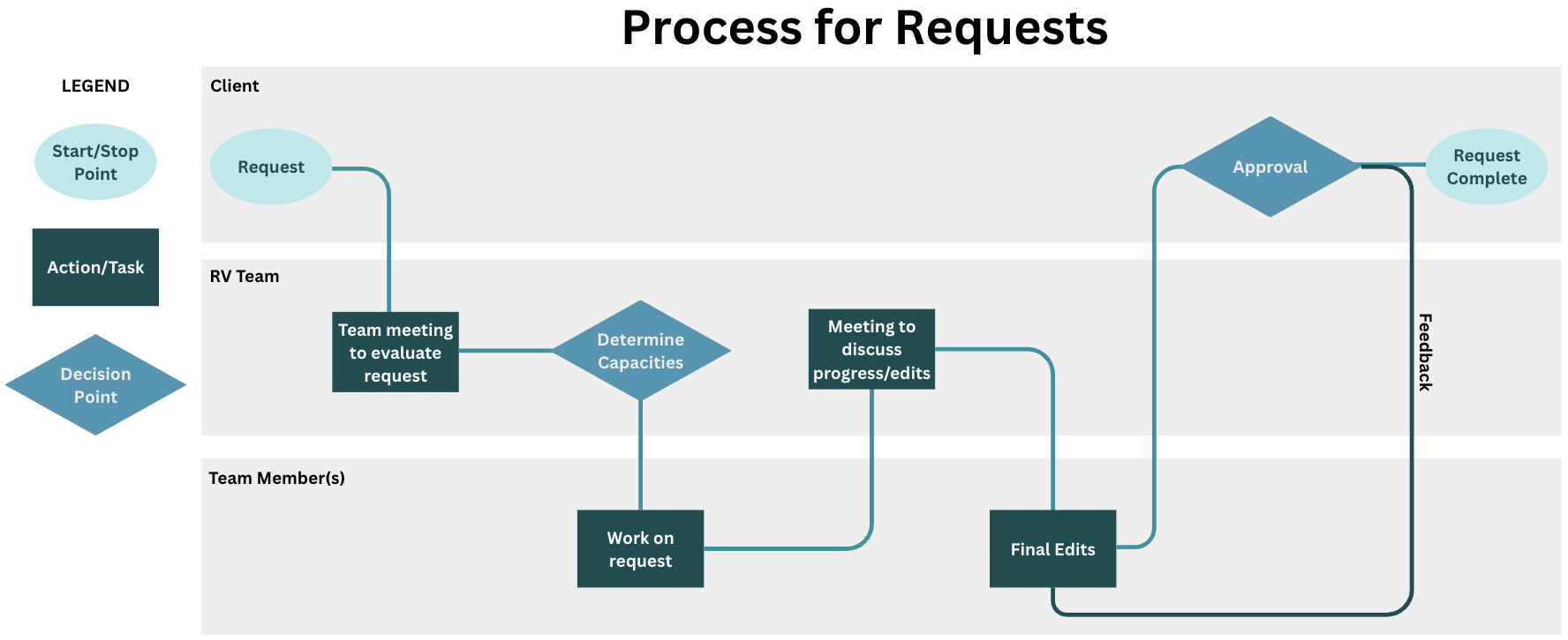 Below is an example of a process map that Project Managers create to make the process more efficient and ensure better use of a company’s time, budgets and end resources
